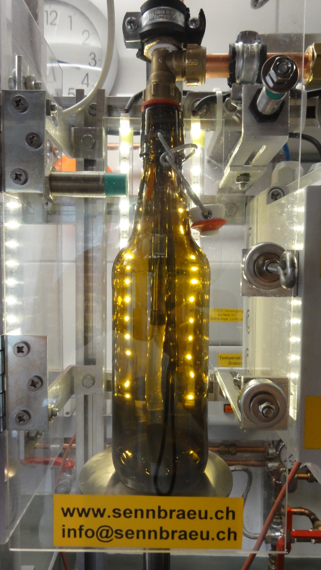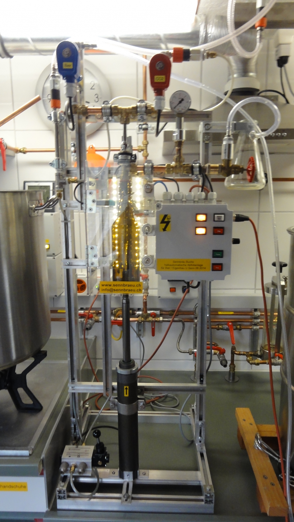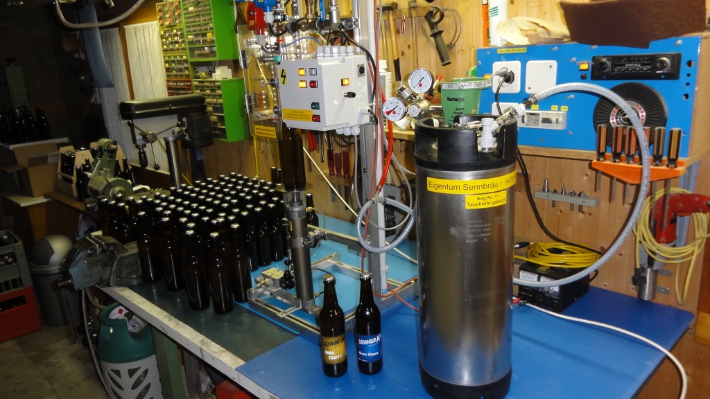 Um die Qualität ein weiteres Mal zu steigern haben wir uns zum Bau einer Abfüllanlage entschieden. Nach mehreren Wochen Arbeit konnte Ueli Senn die Anlage schlussendlich in Betrieb nehmen. Mit dieser weiteren Innovation kann in naher Zukunft auf die Flaschengärung verzichtet werden. Mit dem Einsatz von Keg kann von nun an die Flasche mit bereits kohlensäurehaltigem Bier gefüllt werden. Diese Technik ermöglicht uns ein reines Bier, ohne jegliche Rückstände von Hefe zu präsentieren. Des Weiteren ist es möglich das Bier frisch ab Fass zu zapfen.