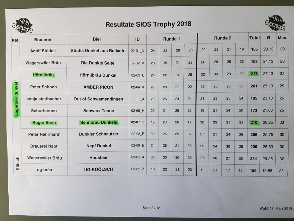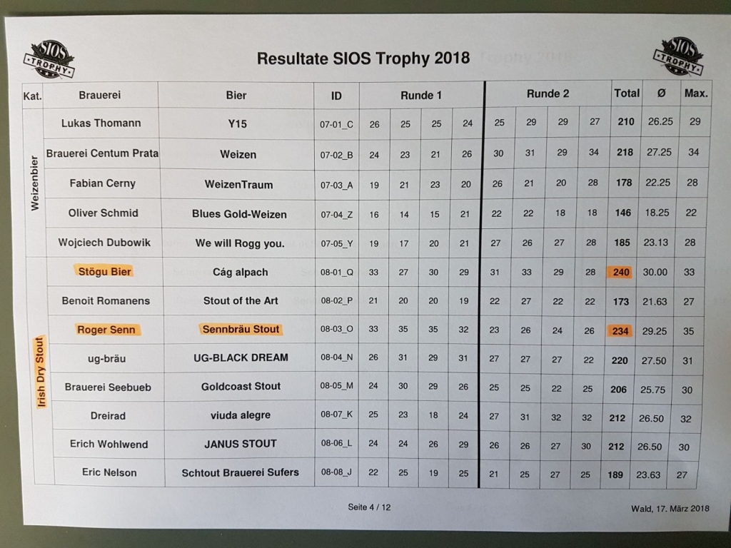 SIOS Trophy 2018: Auch im Frühjahr 2018 konnten wir auftrumpfen. Mit unserem Stout haben wir den 2. Rang erreicht. Ein weiteres Zeichen, dass Sennbräu auch bei überaus speziellen Bieren erfolgreich sein kann.